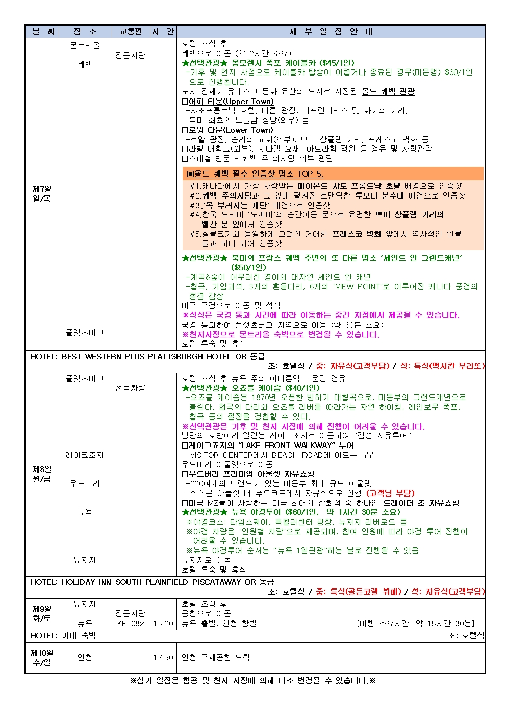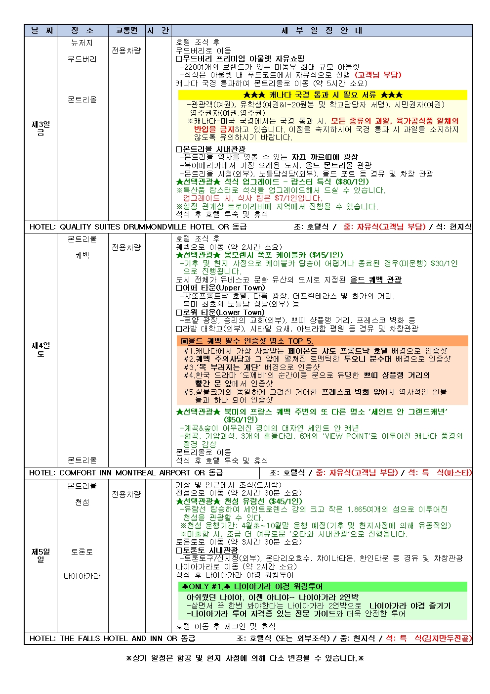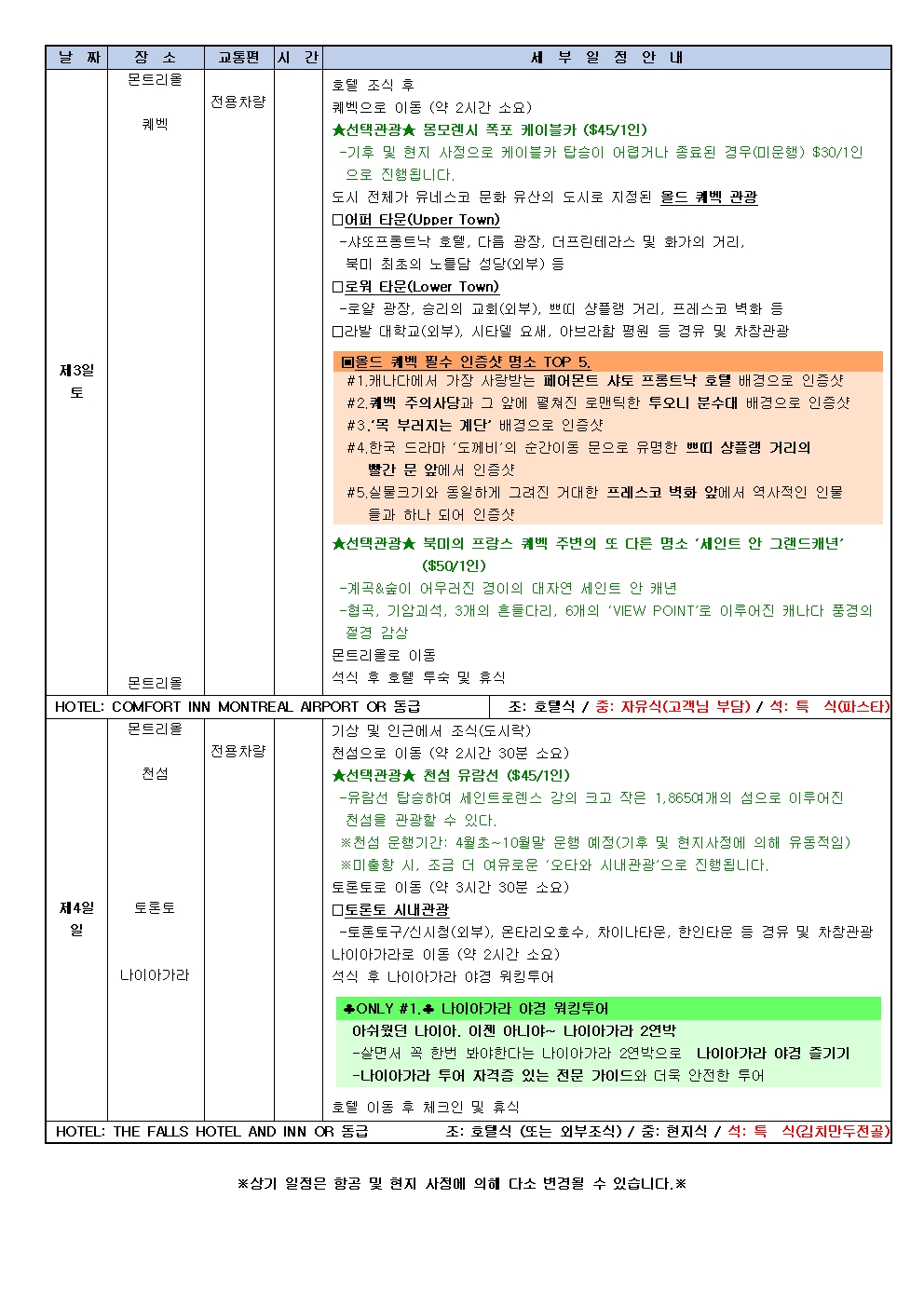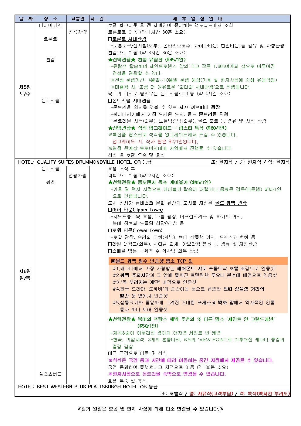 ※현지사정으로 몬트리올 숙박으로 변경될 수 있습니다.
