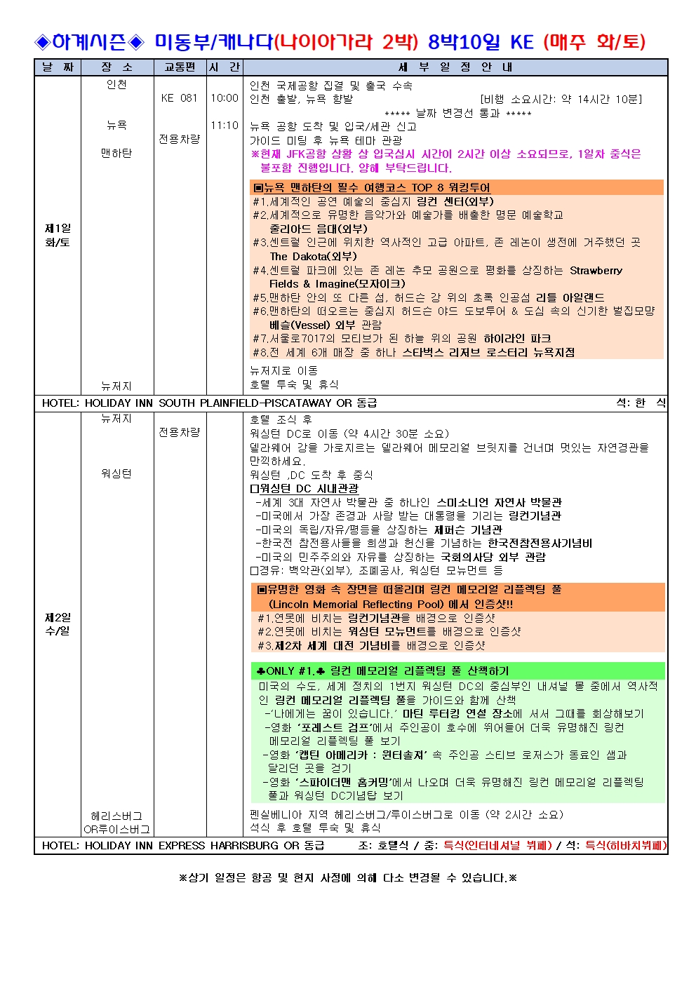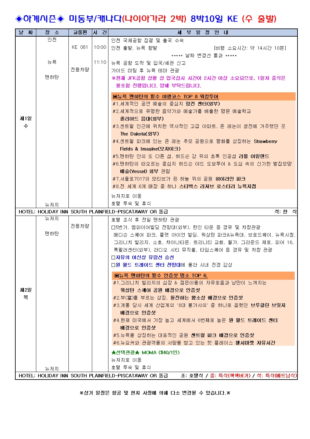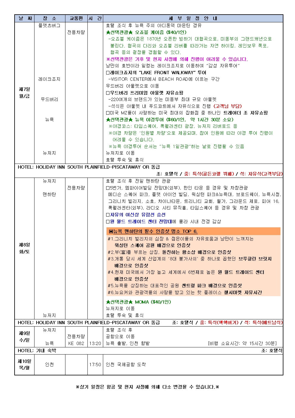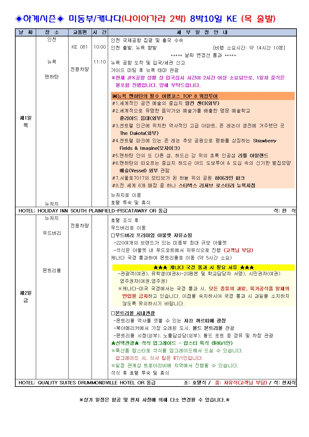 ※현지사정으로 몬트리올 숙박으로 변경될 수 있습니다.