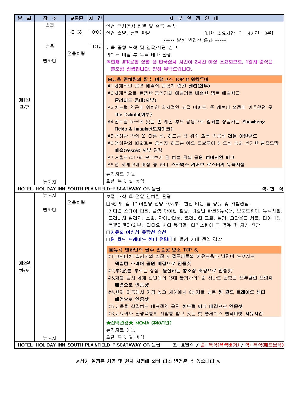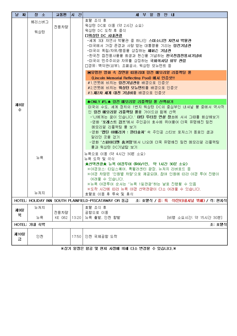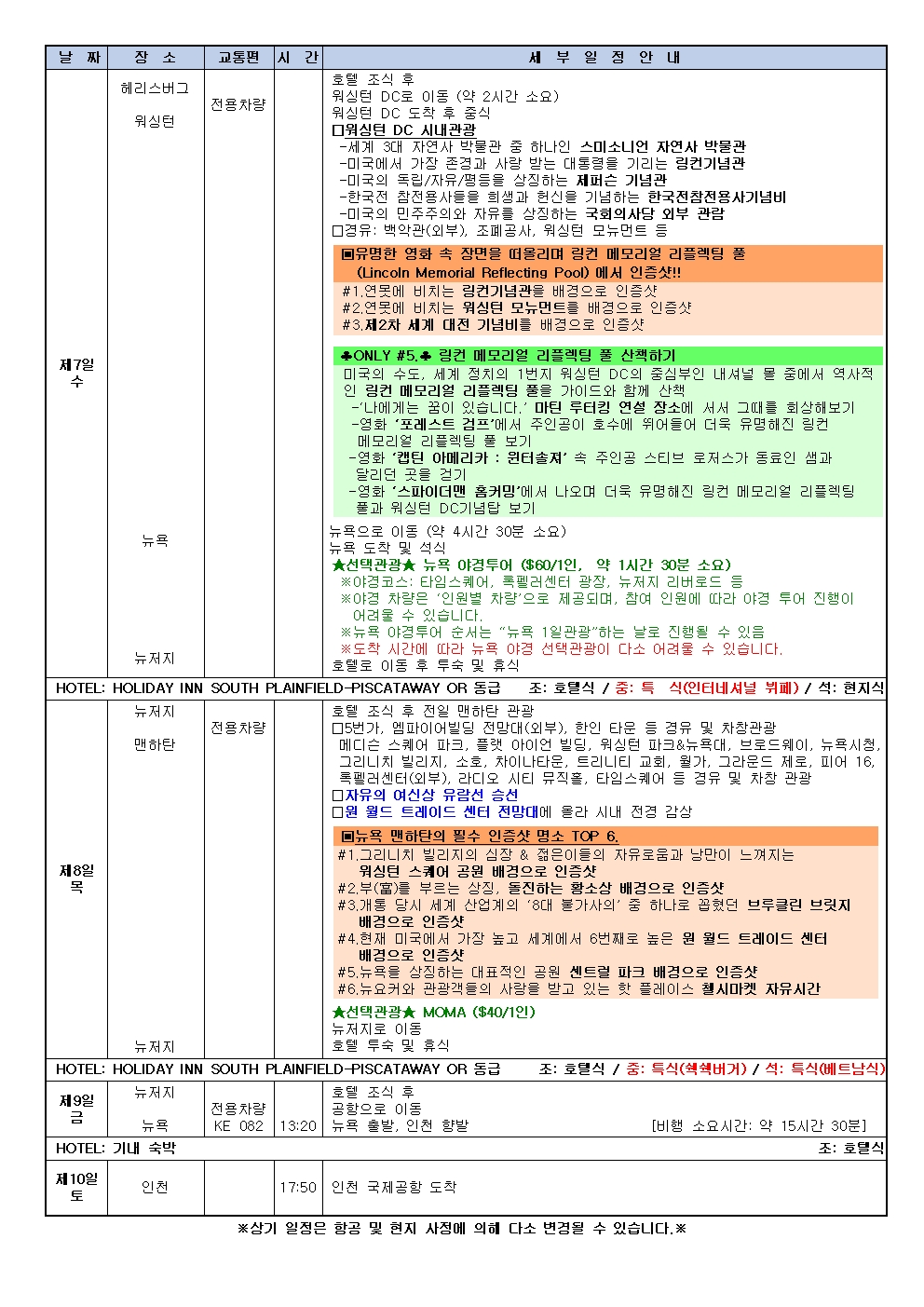 석식 후 호텔 토숙 및 휴식호텔 HOLIDAY INN PISCATAWAY HOTEL 또는 동급 식사 [조식]호텔식 [중식]특식(쉑쉑버거) [석식]특식(베트남식) -