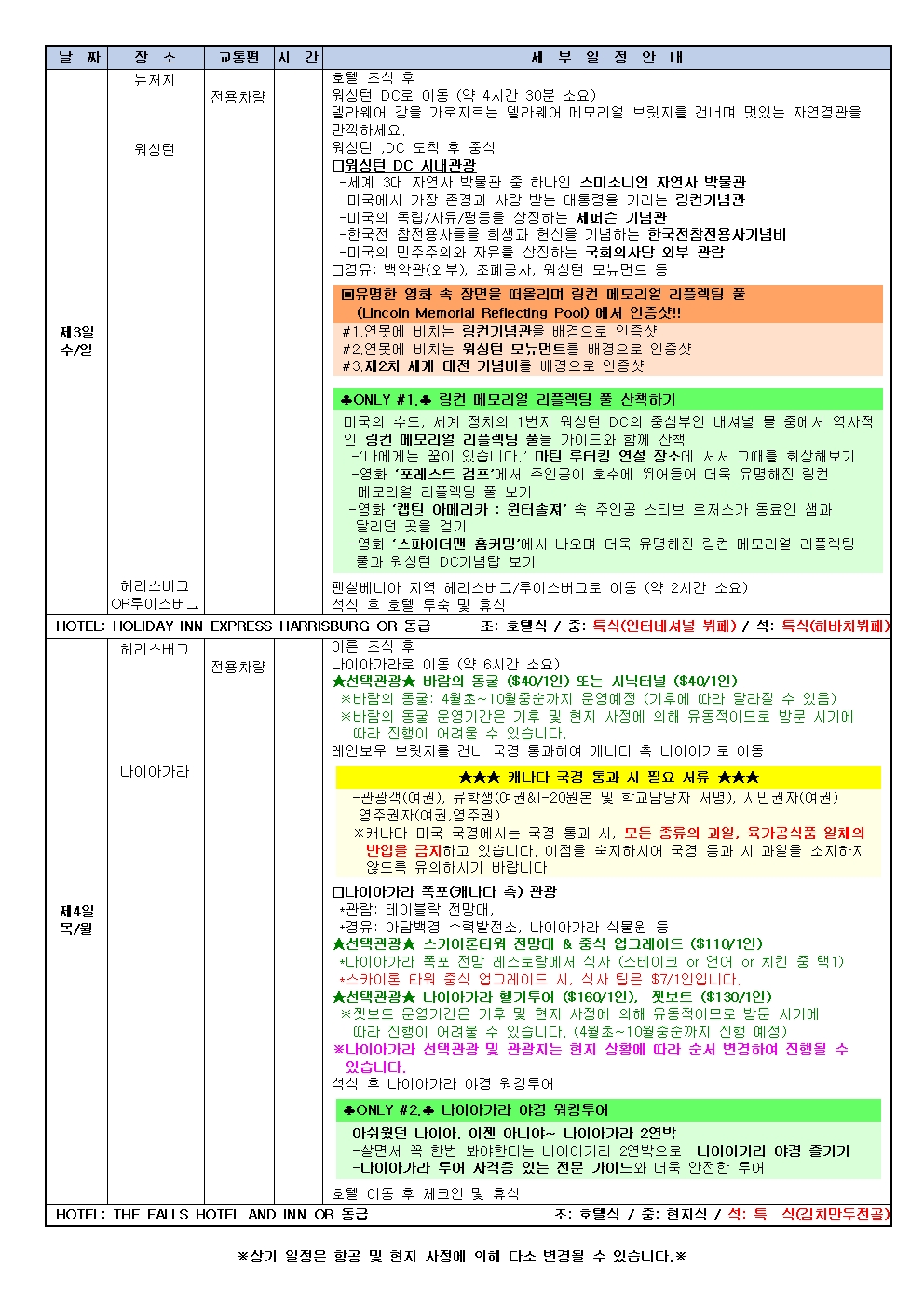 ※ 국경 통과 시 차량 통행량과 날씨, 이민국 업무로 인해 일정변경이 예고없이 진행 될 수 있습니다.