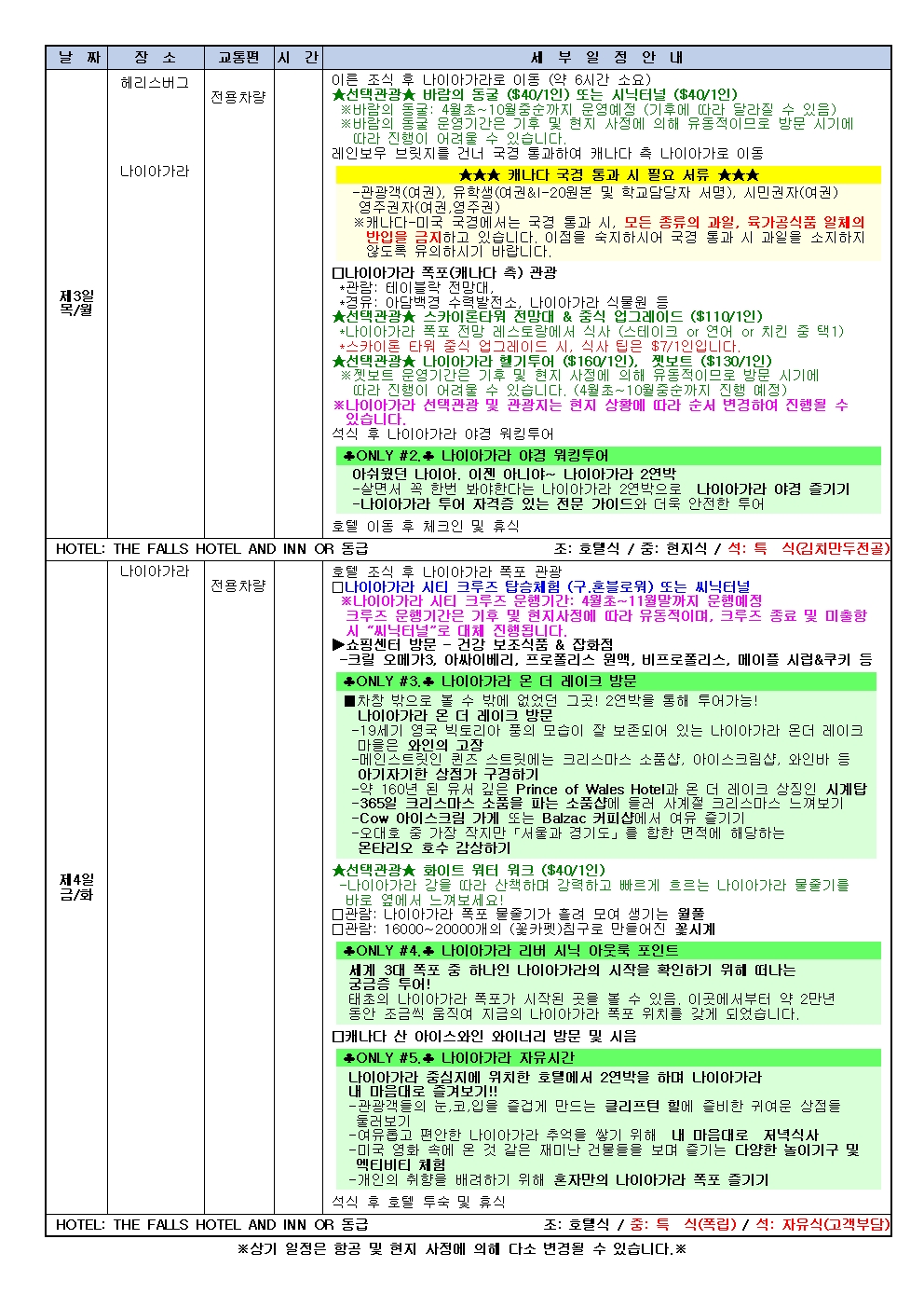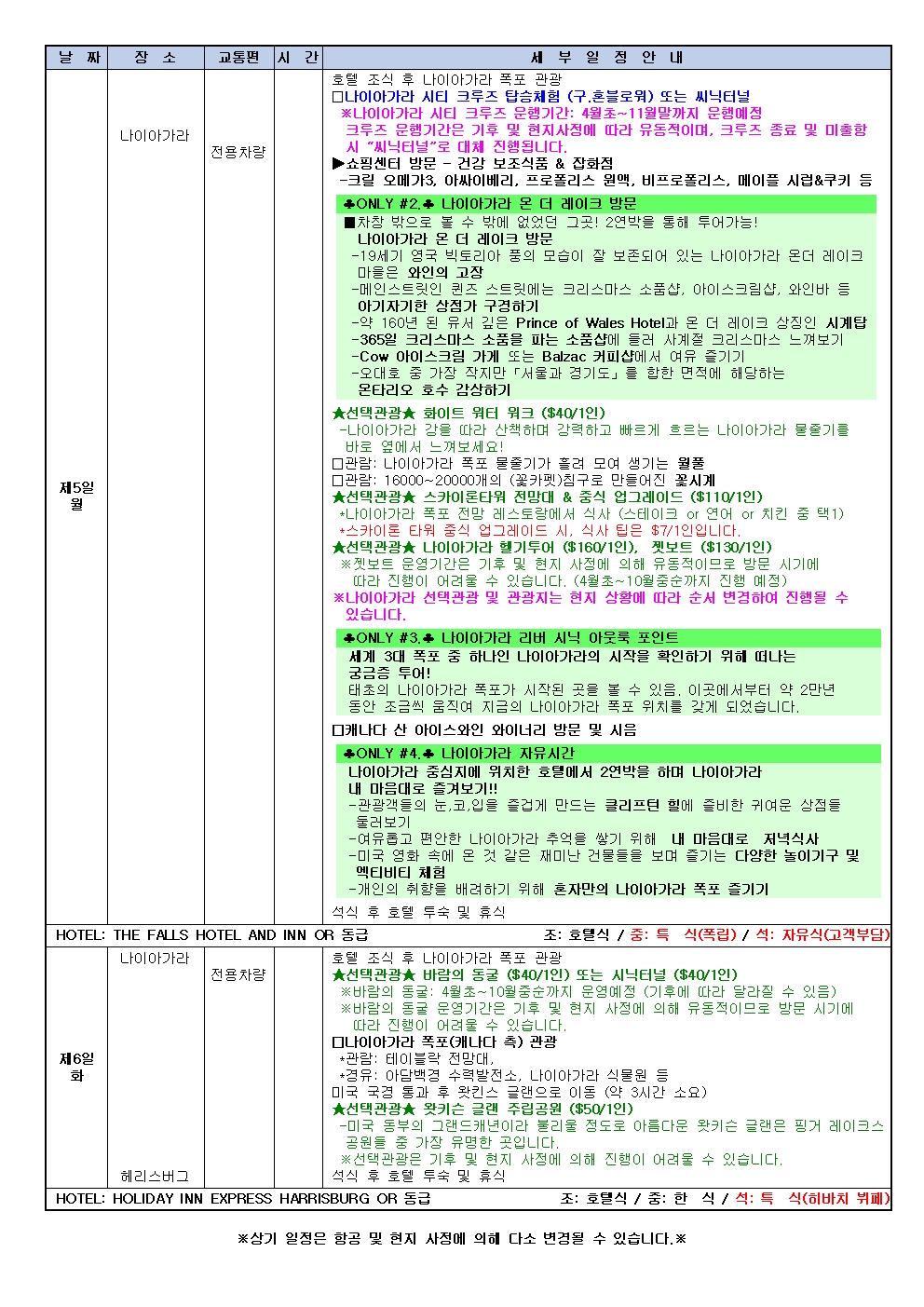 @선택관광 : 나이아가라 씨닉터널(약 60분)요금 - 성인 : 40 / 아동 : 40 / 유아 : 0대체 일정 : 테이블락에서 폭포 관람 (가이드미동행)