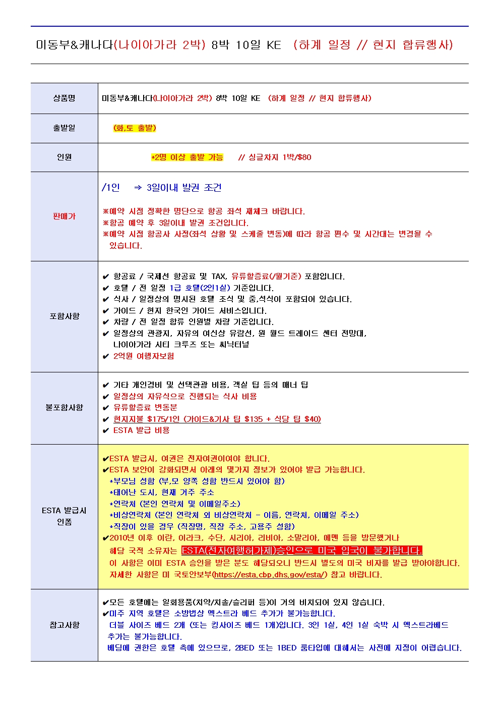 ■ 나이아가라 도착 후 폭포주변 관광 및 토산품점 방문※ 현지사정 및 시간관계상 나이아가라 관광 다음 날에 나눠 진행될 수 있습니다.@선택관광 : 나이아가라 헬기투어(약 1시간)요금 - 성인 : 160 / 아동 : 160 / 유아 : 0대체 일정 : 기념품점 및 라운지 자유 시간