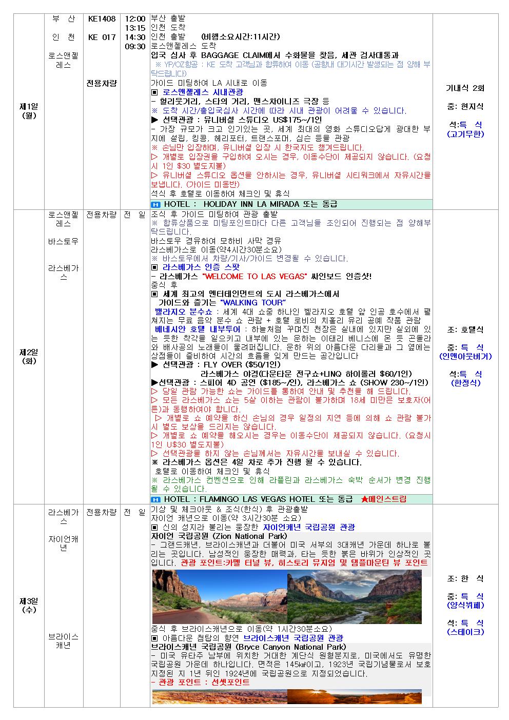 관광지 입장료 : 라스베가스 메인 스트립 호텔 숙박, 그랜드캐년, 자이언캐년, 브라이스캐년, 요세미티 국립공원, 몬트레이 17마일 드라이브코스