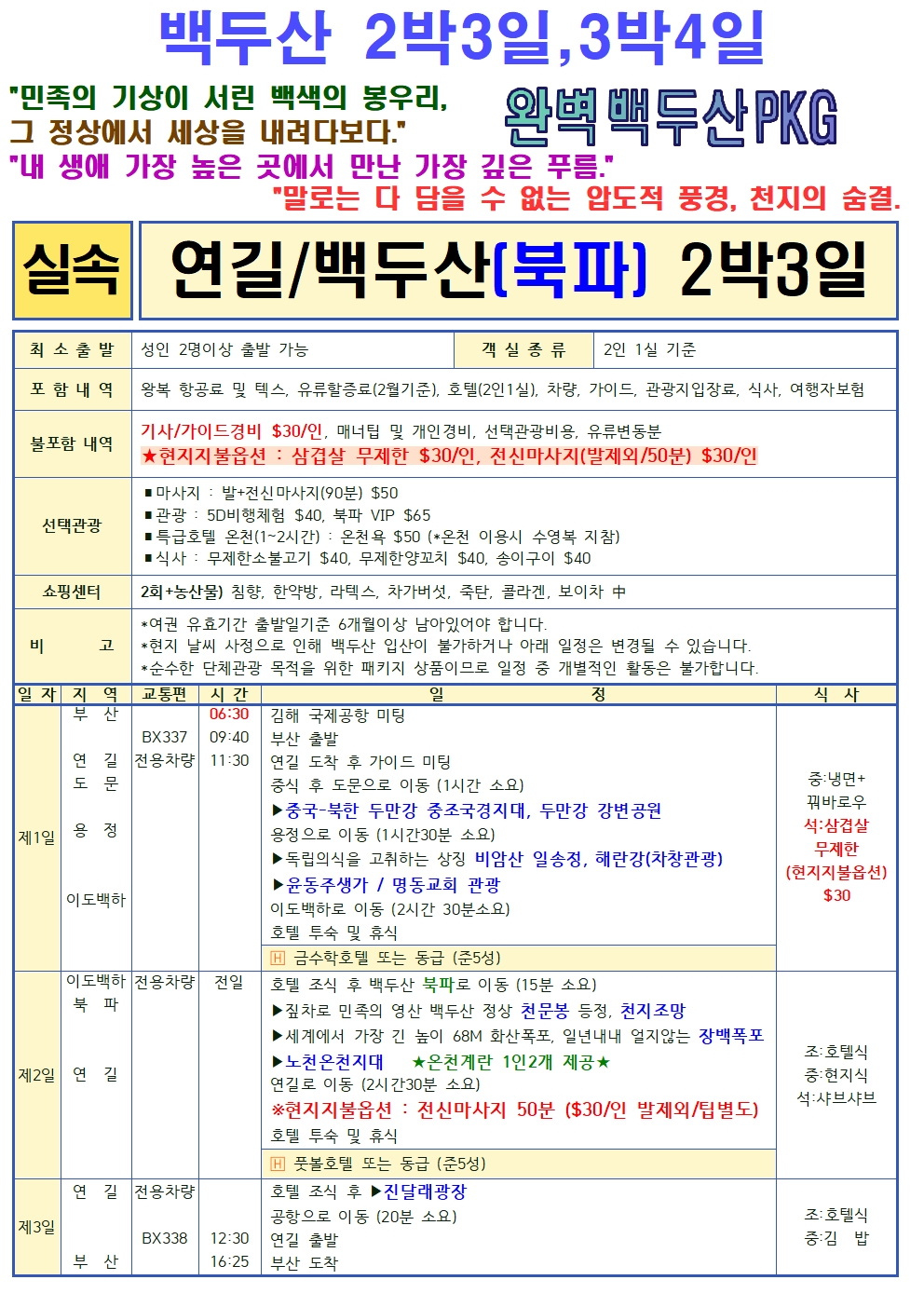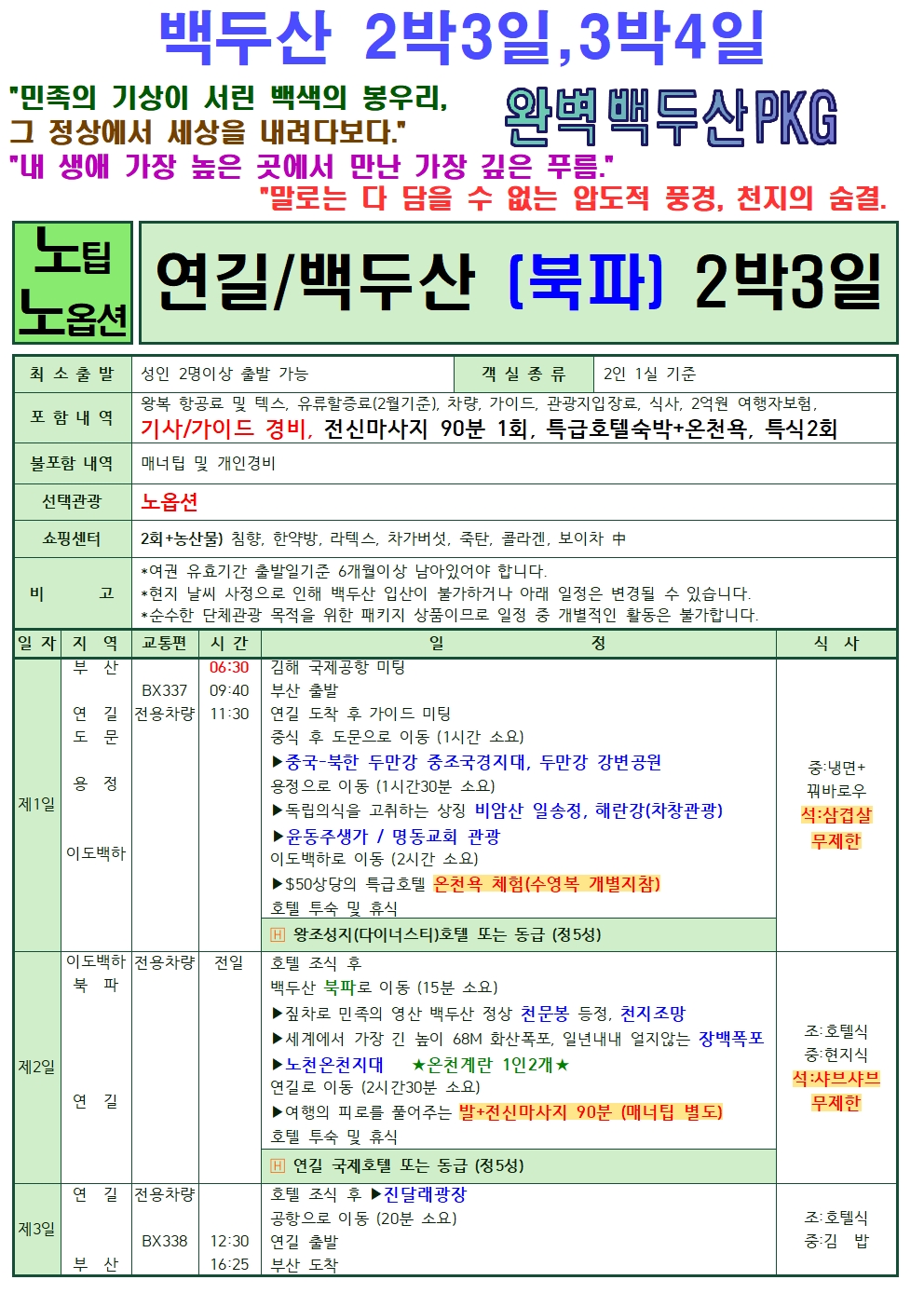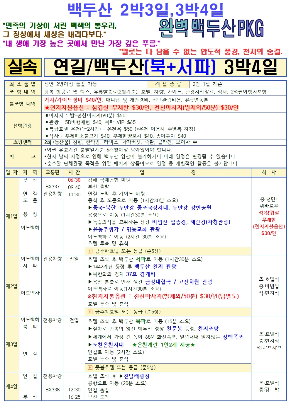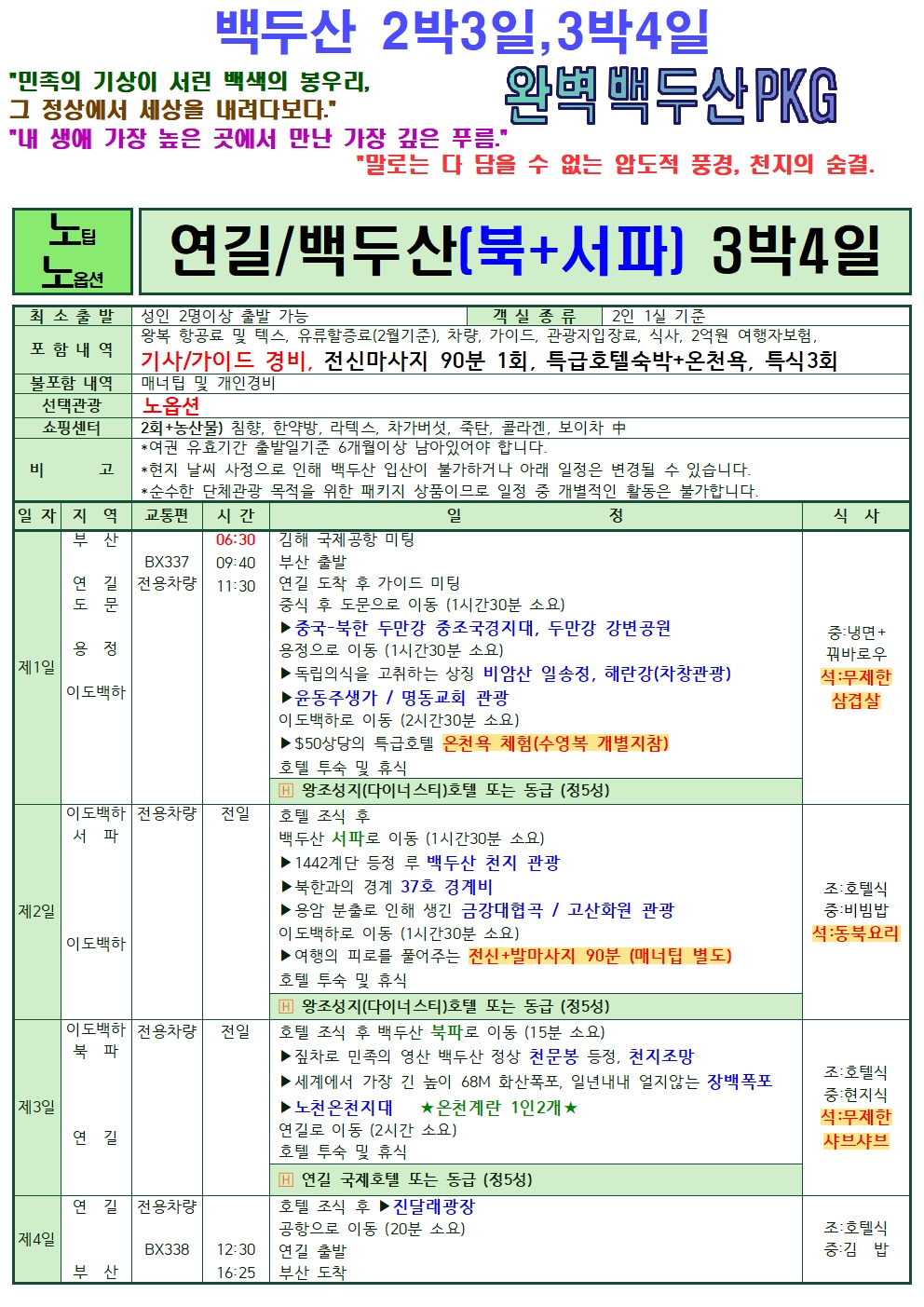[부산출발]◈ 백두산 서파 북파 [2박3일, 3박4일] 4가지상품 ◈